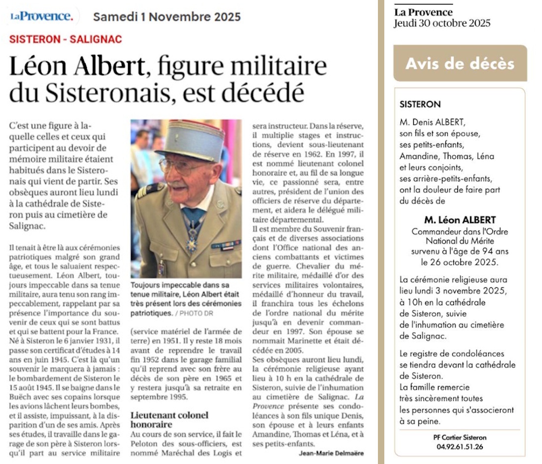 Vous trouverez ci-après l'article publié le 1er novembre, par le journal « La Provence », ainsi que l’avis de décès publié ce 30 octobre.